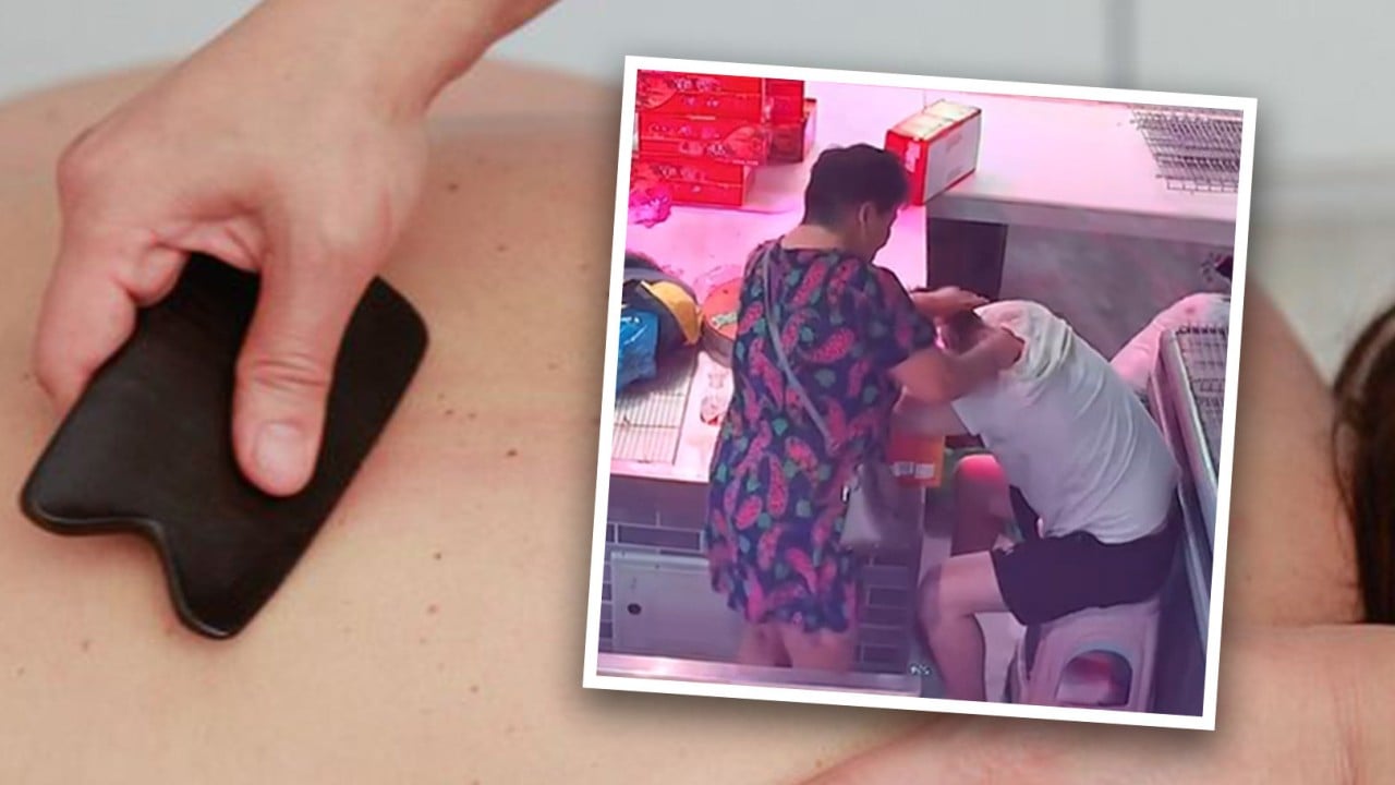 A video of a woman in China who saw a sleeping man slumped over his food stall, mistook his hangover for illness and began giving him a gua sha scraping massage has delighted mainland social media.