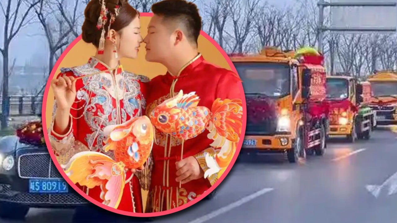 A man in China who followed his parents into the sewage removal business has used nine septic tank trucks to greet his bride on their wedding day.